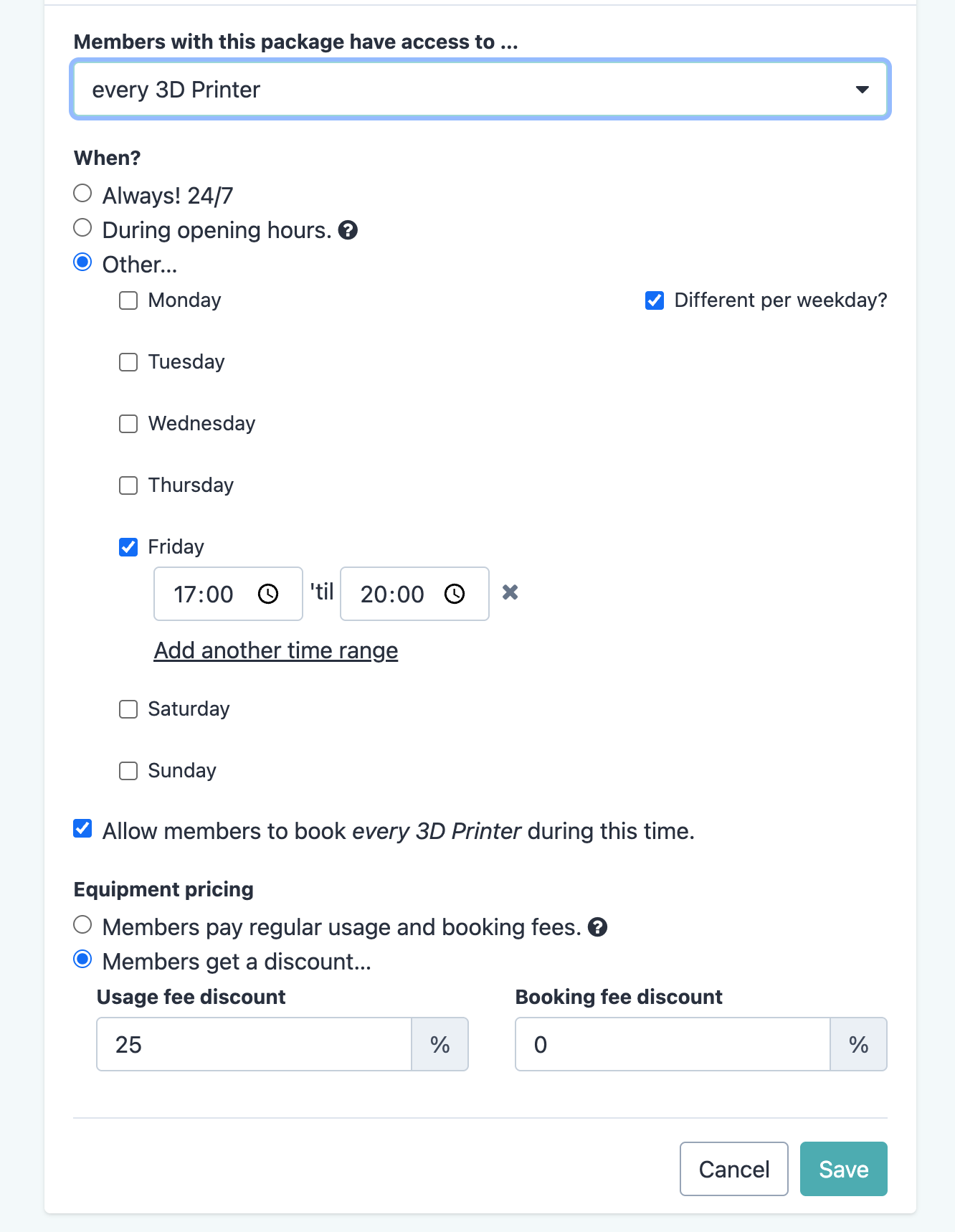 Yes, you can easily add a permission that gives some (or all) members a discount on some (or all) machines on a particular weekday and/or at a particular time: